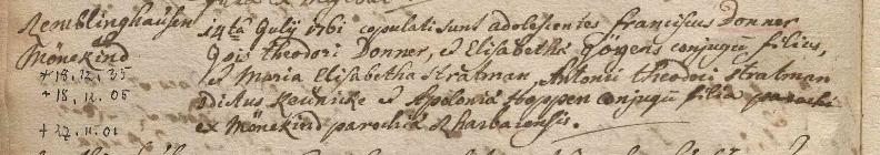 Kinder mit: Franz Heinrich Donner (* 18.12.1735 Remblinghausen + 18.12.1805 Remblinghausen), Hoferbe, Ackersmann [WEITER BEI GOEDDE] [WEITER BEI SARTORIUS] (oo 14.07.1761 Remblinghausen):