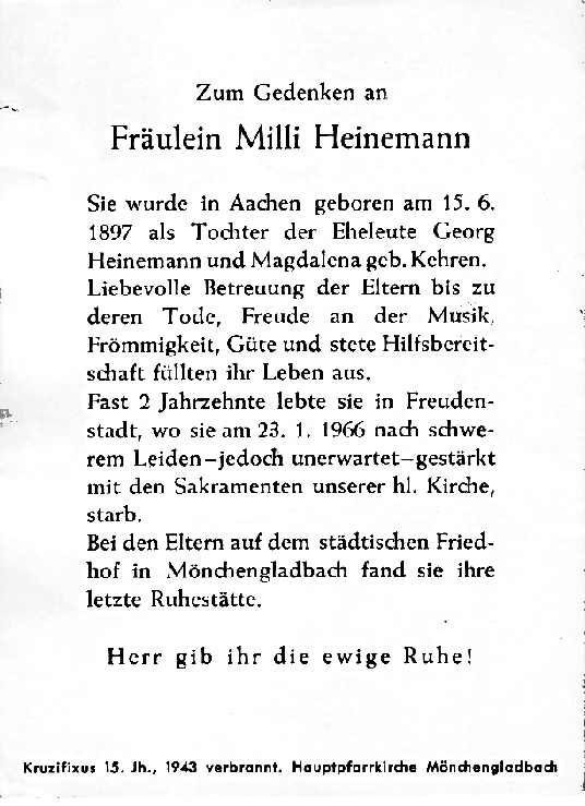- Totenzettel: "Zum Gedenken an Fräulein Milli Heinemann.